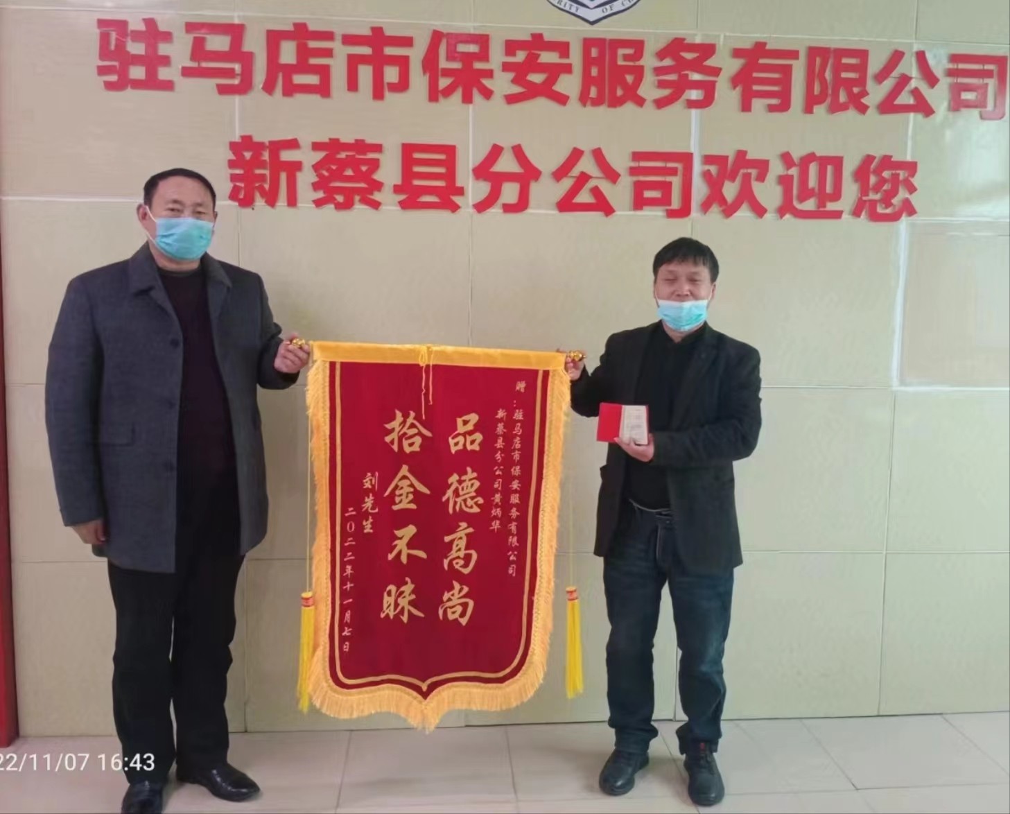 外國語學校崗點保安員黃敏華,在外國語學校附近撿到一個退伍證,想到失主應該很著急,自己能力有限,一時半會也無法找到失主的聯(lián)系方式,于是當天把撿到的退伍證交到公司,公司收到后四處聯(lián)系找尋失主,經(jīng)過多方查找聯(lián)系到失主。失主于2022年11月7日到公司把退伍證領(lǐng)走。失主這次失而復得的經(jīng)歷,使他真切的感受到保安公司人員拾金不昧的高尚品質(zhì)和保安公司助人為樂的雷鋒精神,特送上錦旗一面,表示感謝。