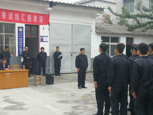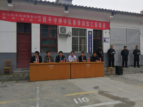 時值初夏,萬物競秀。2019年5月15日上午10時許,西平守押中隊2019年春季大練兵匯報表演在環(huán)城農(nóng)商行院內(nèi)如期進(jìn)行。駐馬店市保安服務(wù)公司副總經(jīng)理鄧?yán)^國、押運(yùn)分公司副經(jīng)理楊新政等考核組一行,在西平分公司經(jīng)理高合群、副經(jīng)理于恩榮和客戶單位保衛(wèi)科長的陪同下一同觀摩此次匯演。