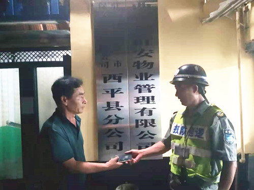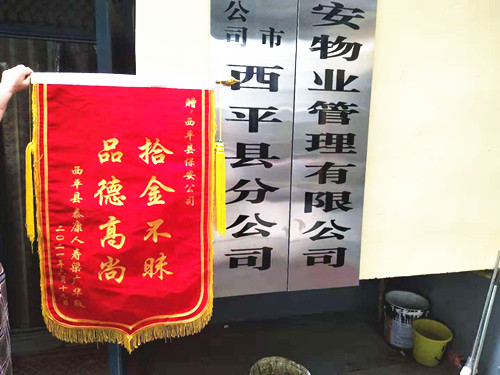駐馬店市保安服務(wù)有限公司西平縣分公司技防巡邏員張聚才,在2021年6月19日19時(shí)巡邏到西平縣文化路工商銀行ATM內(nèi)拾到一部手機(jī)。巡邏任務(wù)完成后及時(shí)與失主取得聯(lián)系,失主拿到失而復(fù)得手機(jī)連聲說“謝謝”,謝謝!手機(jī)不值幾個(gè)錢,但是手機(jī)內(nèi)信息和微信、支付寶等等都不能用。讓人很著急,要是讓不法分子拾到對我個(gè)人的損失不可想像。第二天失主把一面錦旗送到公司。公司例會上對張聚才獎(jiǎng)勵(lì)現(xiàn)金100元。公司號召大家對張聚才拾金不昧的精神大家要學(xué)習(xí)和宣傳。