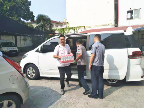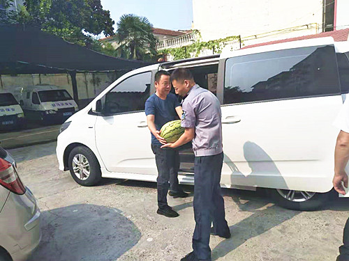 2021年8月3日駐馬店市保安服務(wù)有限公司西平縣分公司常務(wù)副經(jīng)理周保卿和副經(jīng)理冀學(xué)軍代表分公司到西平收押大隊(duì)進(jìn)行慰問(wèn),在炎炎夏日送去清涼礦泉水和大西瓜。