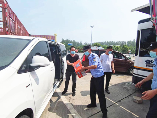 2022年7月12日上午10點(diǎn)多,西平分公司班子成員在經(jīng)理高合群的帶領(lǐng)下來到西平高速公路收費(fèi)站卡口進(jìn)行慰問,同時(shí)帶去了礦泉水、方便面、火腿腸和大西瓜等清熱解暑食品。西平縣公安局馮戰(zhàn)武副局長和交通局張副局長接待了慰問組,對西平分公司的大力支持表示感謝。
