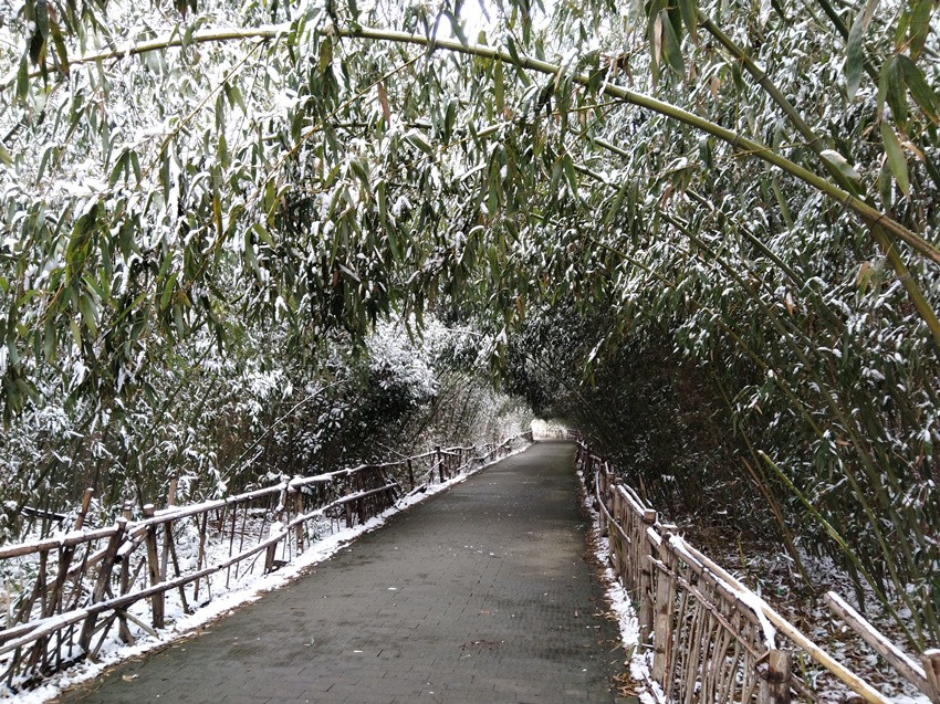 入园,墨瓦白墙,雕金木门,琉璃飞檐,斗拱重重,在浩然一色的雪中,更显得朴素凝重,古色古香。门后,青砖铺地,小径九曲。尽头,拱虹斜挂,石桥耸立。信步拾阶而上,桥下冰河蜿蜒,河中枯苇纵横。两侧迎寒青松滴翠,几株傲雪红梅流芳。雪压绿竹,俯身似迎客,冰裹玉枝,侧卧如依人。雕栏画栋,长廊深邃通幽,素描淡写,精舍别趣横生。仰望天中山,不在高而人杰地灵,俯瞰九州图,大一统愿国泰民安。