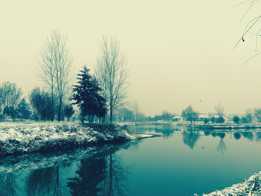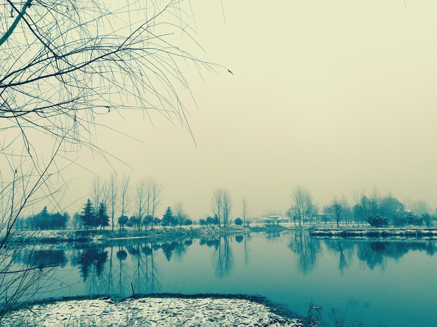 冬日的鹅鸭池,宁静幽远。少了夏日的波光潋滟,也无秋日的碧水无痕,这一汪清潭,如墨玉般凝重深沉,仿佛深不见底,如翡翠般温润内敛,灵动隐约可见。虚映着岸边的景致,上下难辨。天似画布水如镜,一线中分叠双影,苍穹倒悬浑不分,只因已是画中人。